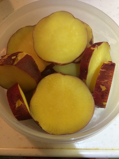 さつまいもは数ミリの厚さに輪切りにします。